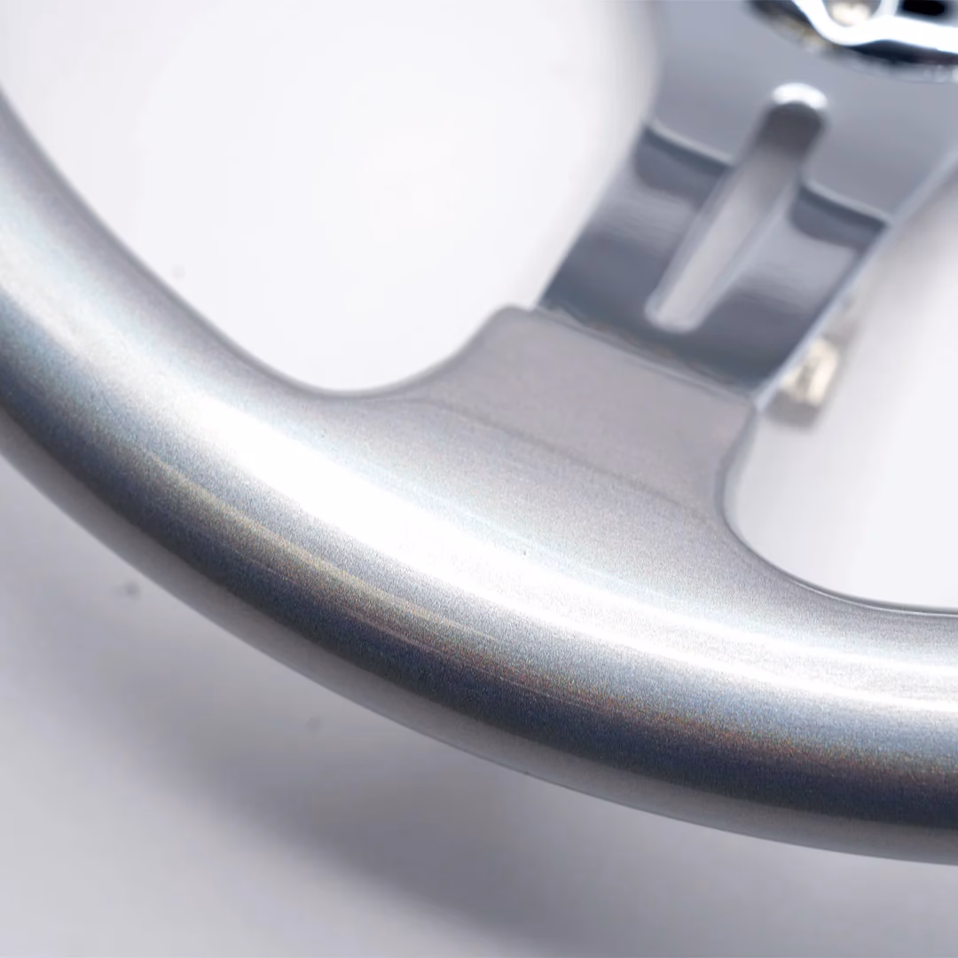 Conoce el volante de la serie cromática con vetas de madera. Tomamos el atractivo atemporal de la veta madera y añadimos un rediseño metálico brillante porque el cromo nunca pasa de moda. Despídete de los colores tradicionales de la madera y da la bienvenida a un volante con brillo y vibraciones retrofuturistas.